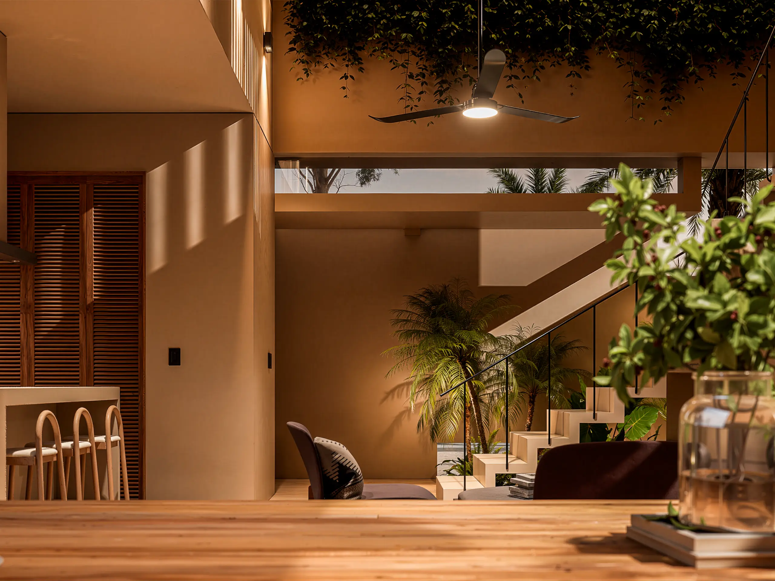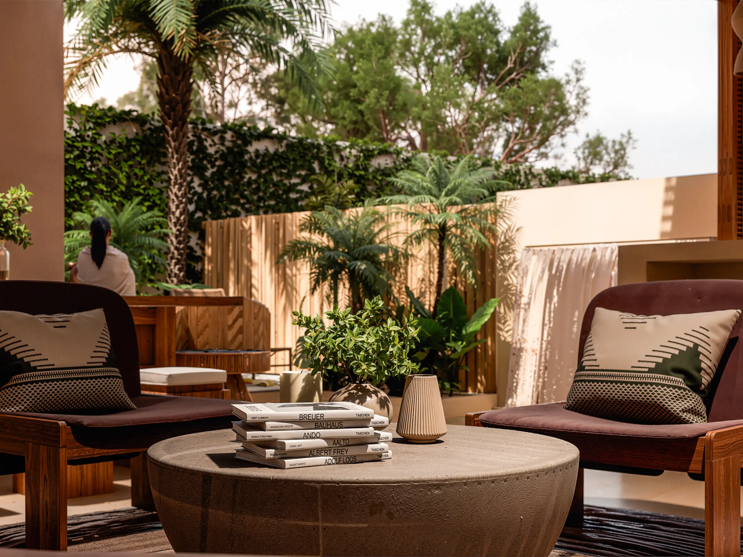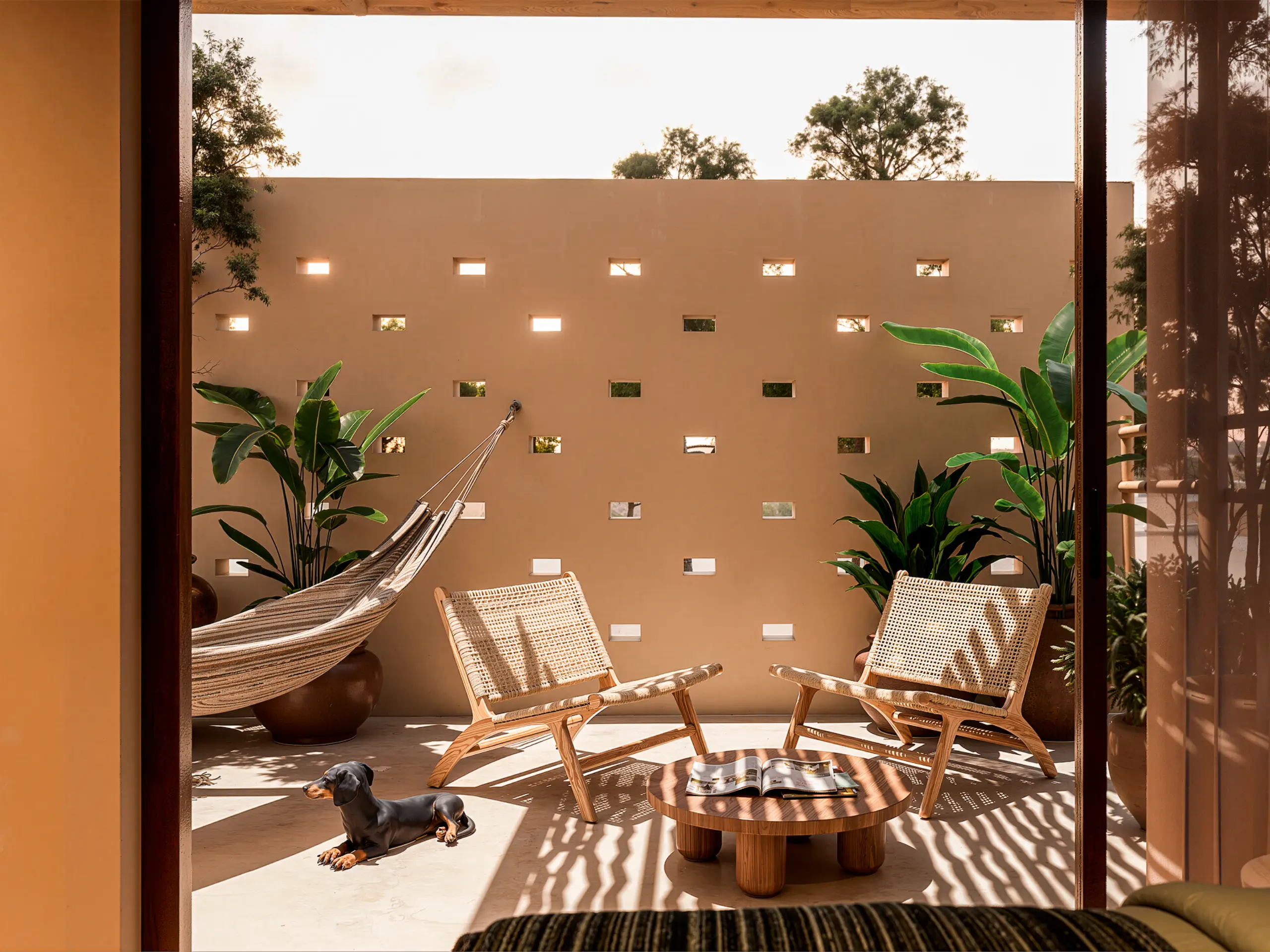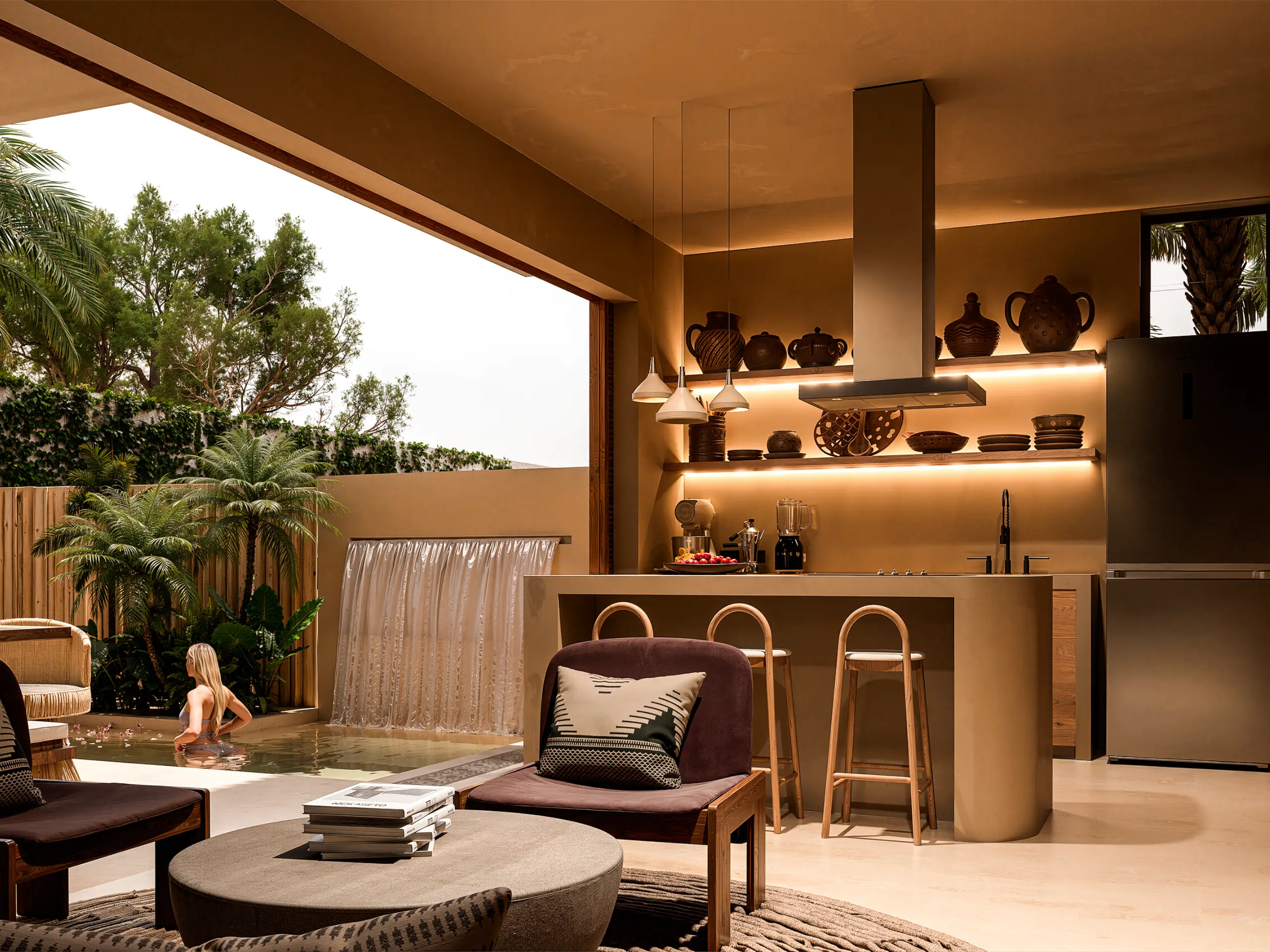 Su arquitectura es sobria, atemporal y profundamente conectada al sitio, con una materialidad inspirada en los atardeceres de la costa oaxaqueña, traducidos en tonos cálidos, texturas naturales y una composición que prioriza la calma, la privacidad y la experiencia sensorial del espacio.